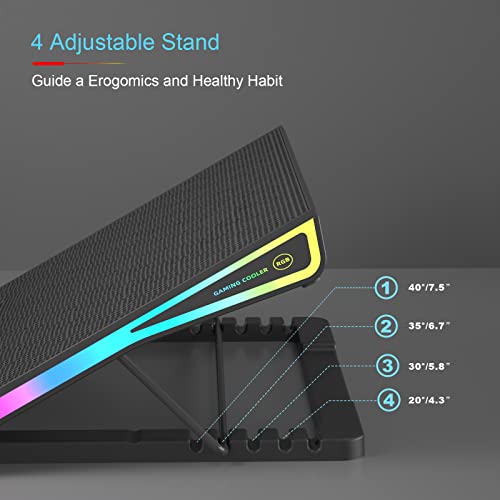 [RGB Colorful Lights] This laptop cooler has LED glaring colorful light with RGB colors on 2 sides with 7 modes to create a cool gaming atmosphere. You just need 1 click to change different modes in the cycles and a long press of around 3 seconds to turn off the RGB lights.