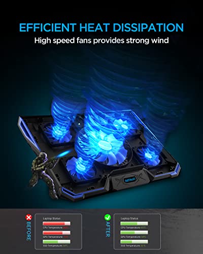 ✔【5 Super Quiet Cooling Fans & Blue LED Light】 Laptop Fan Cooling Pad has 1 ultra big fan(5.51inch) and 4 quiet turbo-fans(3.15inch), 3 wind speeds modes provide optimal airflow and take away heat quickly; Each fan is equipped with blue LED lights, show you which fan is working.