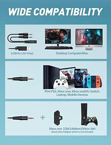 ?Wide Compatibility ?Compatible with all smartphones, Chromebooks, iPads, tablets, computers, laptops, PC, Mac, PS4, Xbox One, Nintendo Switch, and all 3.5mm audio jack devices, allowing you to enjoy an unfair audio advantage across almost every platform. Notice: USB interface only for LED light.