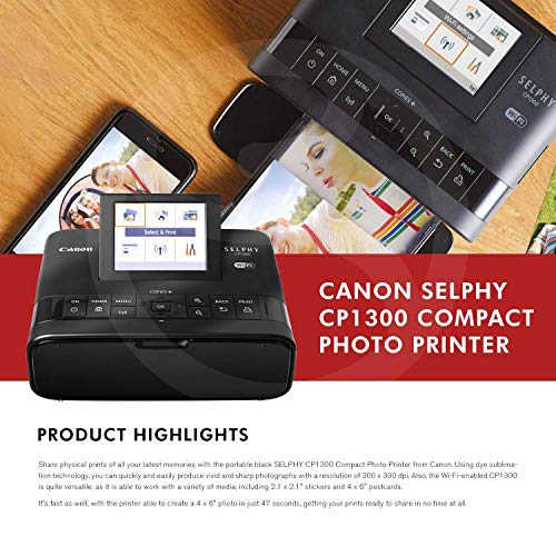 The SELPHY CP1300 Compact Photo Printer offers the creativity you need in a stylish and portable package. Designed for compact on-the-go printing, the SELPHY CP1300 Printer captures your memories anywhere you go – simply connect it to your computer, smartphone1, memory card 2, or USB flash drive for a fun and convenient way to print anytime. Customize your favorite images with a selection of borders and effects for a personalized look, plus choose from a variety of dimensions, including card size (2.1″ x 3.4″), postcard (4″ x 6″), and square label (2.1 ” x 2.1″). Maximum Print Speed (Black): 0.8 ppm; Network Ready: Yes; Printer Type: Photo; Print Resolution (Color) (Width x Height): 300 x 300 dpi.