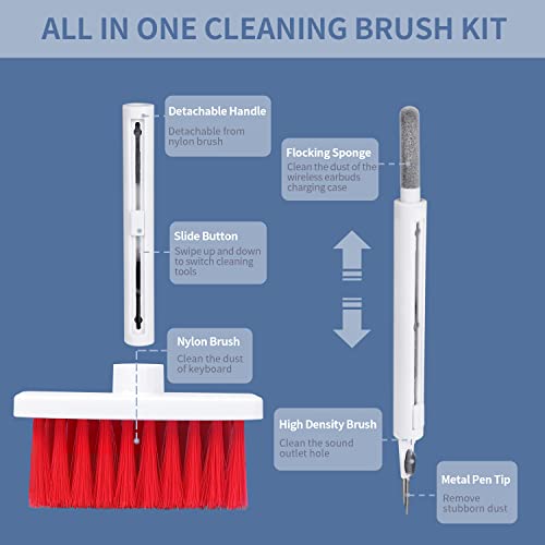 【Multifunction Cleaning Kit】 Flocking sponge can clean the dust in the wireless charging case of the earphone. High-density brush can clean the dirt on the sound outlet hole of the earphone. Metal pen tip can clean the stubborn dust.With a simple key puller, the change of key cap is no longer laborious and the removal of key cap is cleaner and more thorough. Soft nylon brush with moderate softness and hardness make dust nowhere to hide.
