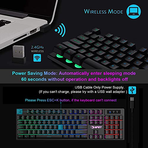 NPET K32 Wireless Gaming Keyboard RGB with Wrist Rest – Long-Lasting Rechargeable Battery – Quick and Quiet Typing…