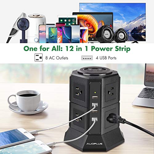 ☑️ Desktop Power Strip Tower – Surge protector power strip comes with 8 AC outlets & 4 USB ports, enabling you to plug in up to 12 different electrical devices at the same time. Single USB port can charge up to 4.5A, fit for cell phones, tablets, and more USB devices; 10A heavy-duty extension cord rated 1250W, it can handle most appliances like TV, coffee maker, computer, etc.