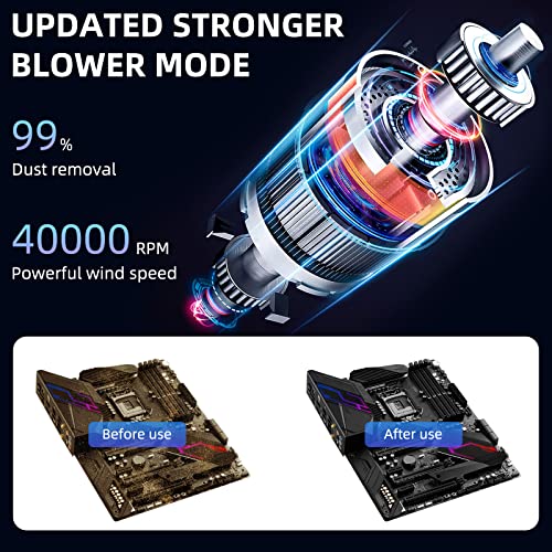 🌀ENHANCED CLEANING POWER: ❶.Upgrade max power 60W, 40000 RPM motor provides ultra-strong airflow for deep cleaning of microscopic dust. ❷.Fit for different devices cleaning ranging from the computer, camera lens, PS4/5, laptop, air conditioners, sofa, printed circuit boards to electronic instruments, medical devices cleaning; ❸.Replaces Compressed Spray Gas.