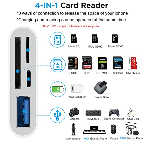 【4 in 1 Camera Connection Kit】 SD card reader for iphone has multiple interfaces, sd card slot/micro sd card slot/USB3.0 port and charging port for ios devices.The multi-functional design of the usb to iphone adapter allows you to copy photos or videos to your iphone/ipad more easily.This is an excellent choice for copying photos or videos from the camera in a short time!