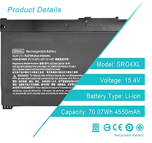 Specifications: Product model: SR04XL SR03X; color: black; Product type: replacement battery; Battery type: lithium ion; Voltage: 15.4V. Capacity: 70.07Wh 4550mAh; Battery quality: 100% brand new and original. Each battery has been factory tested. Class A batteries guarantee fast charging, low power consumption, and circuit protection. CE/FCC/RoHS safety certification.