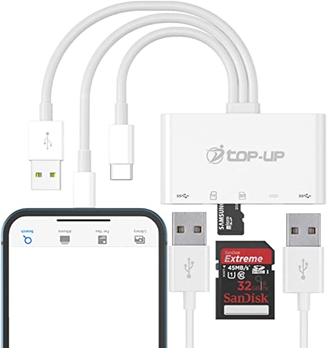 5-IN-1 USB HUB WITH CARD READER: Top-Up brings you a multipurpose smartphone and photography accessory to help extend connectivity for 1x SD slot, 1x Micro SD slot, and 3x USB ports. This card reader USB adapter is perfect for a variety of devices like keyboards, mice, hard drives, Type C smartphones, i-Phones, i-Pad, and others.