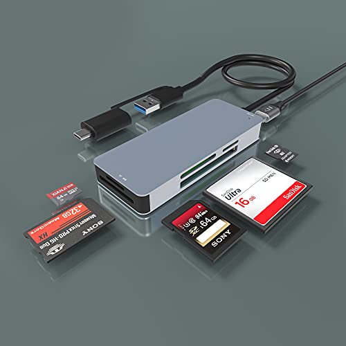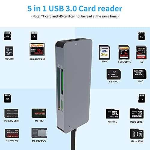 【One Reader for Multi Cards】USB Card Reader is designed with 5 card slots: SD, Micro SD, CF, MS, M2 slots and USB 3.0 connector, which allow you to read and transfer data the most popular flash media on the computer, laptop, tablet through USB 3.0 interface, including SDXC/SDHC/SD/Extreme I III SD/Ultra II SD/MMC/RS-MMC or Micro SD/TF/Micro SDXC/Micro SDHC/UHS-I or CF I 3.0/4.0 /Extreme I III CF/Ultra II CF/HS CF/XS-XS CF/CF Elite Pro/ CF Pro/CF Pro II or MS/MS PRO/MS PRO-HG/MS XC DUO or M2.